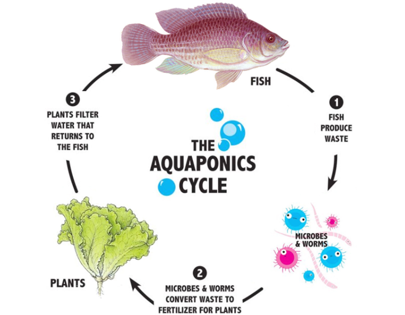 Aquaponics is een systeem voor het kweken van vissen en planten tegelijkertijd. Vissen produceren onder andere door hun ontlasting afvalstoffen die veranderen in nitraten en ammoniak. Een hoge concentratie van nitraat en ammoniak in het water is niet goed voor de vissen, maar ze zijn geweldige meststof voor planten. Terwijl de planten deze voedingsstoffen opnemen zuiveren ze het water en voegen zuurstof aan het water toe, wat in ruil daarvoor weer nodig is voor de vissen.